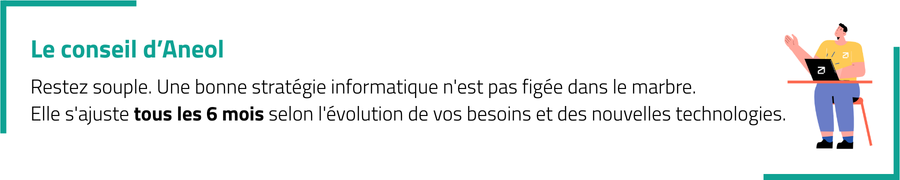 Le conseil d’Aneol : Restez souple. Une bonne stratégie informatique n’est pas figée dans le marbre. Elle s’ajuste tous les 6 mois selon l’évolution de vos besoins et des nouvelles technologies.
